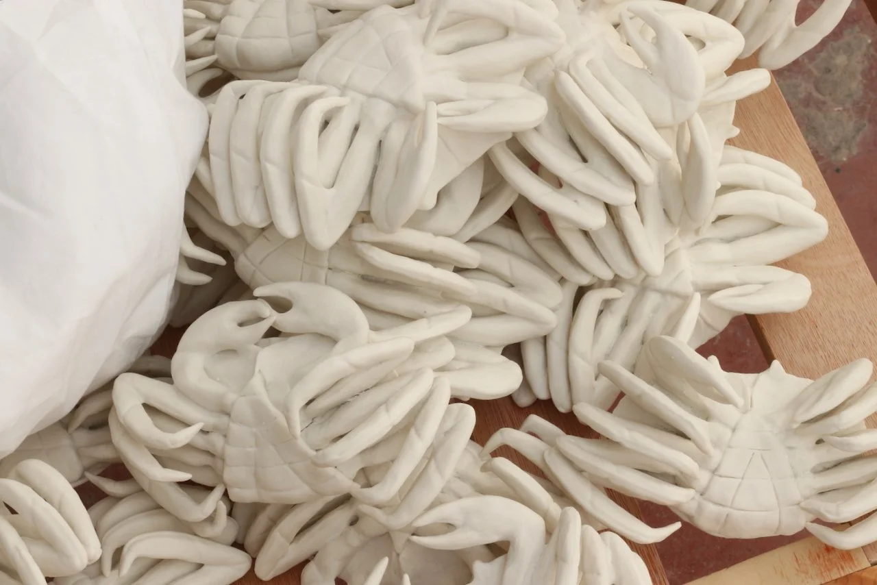 Phoning home came about from a call from Min (mum) after her first trip back home in some time. Crabs are hand-built in unglazed porcelain, and lain on a wooden bedframe. The work places Min’s tales of ‘home’ next to our actual ‘home’ (all of us in the home-bed listening), blurring the distinction between the two. It pairs familiarity with the foreignness and unbelonging that seep into the places I am most comfortable. The title works bi-directionally and recalls a distance both physical and generational. We are both phoning home and we are from each other’s homes, and they don’t quite fit together.