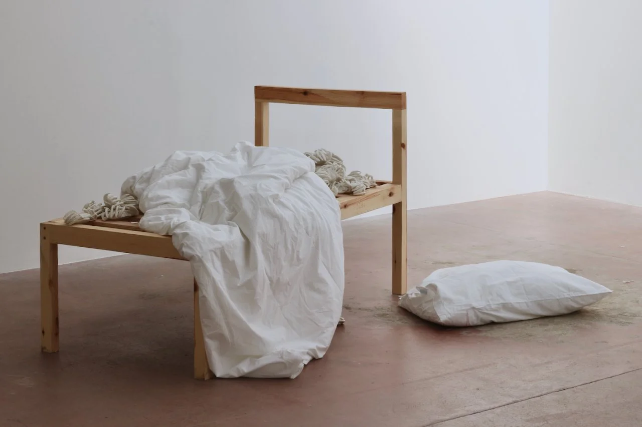 Phoning Home, 2024, Porcelain, Wood, Bedding, 85 x 75 x 140 cm